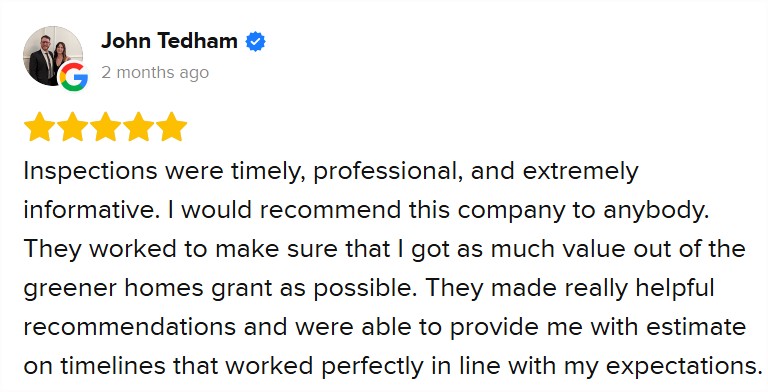 “Inspections were timely, professional, and extremely informative… they worked to make sure that I got as much value out of the greener homes grant as possible.”